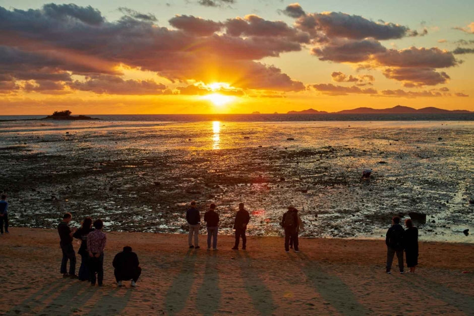 백사장의 길이가 약 1km 정도 펼쳐진 곳으로 해수욕과 서해 바다의 아름다운 석양을 조망할 수 있으며 갯벌체험도 가능한데요. 물이 빠지면 약 1km 정도의 갯벌이 나타나는데, 갯벌의 감촉이 부드럽고 조개, 게 등 갯벌에 서식하는 생물을 관찰할 수 있습니다. 맨발로 갯벌에 들어갈 수도 있지만 발을 다칠 수 있으니 장화나 여분의 신발 등을 미리 준비하는 게 좋겠죠?