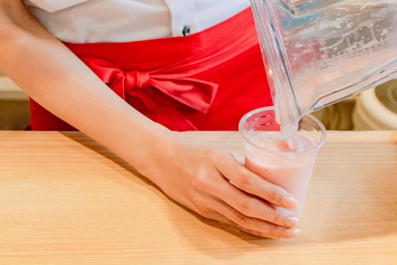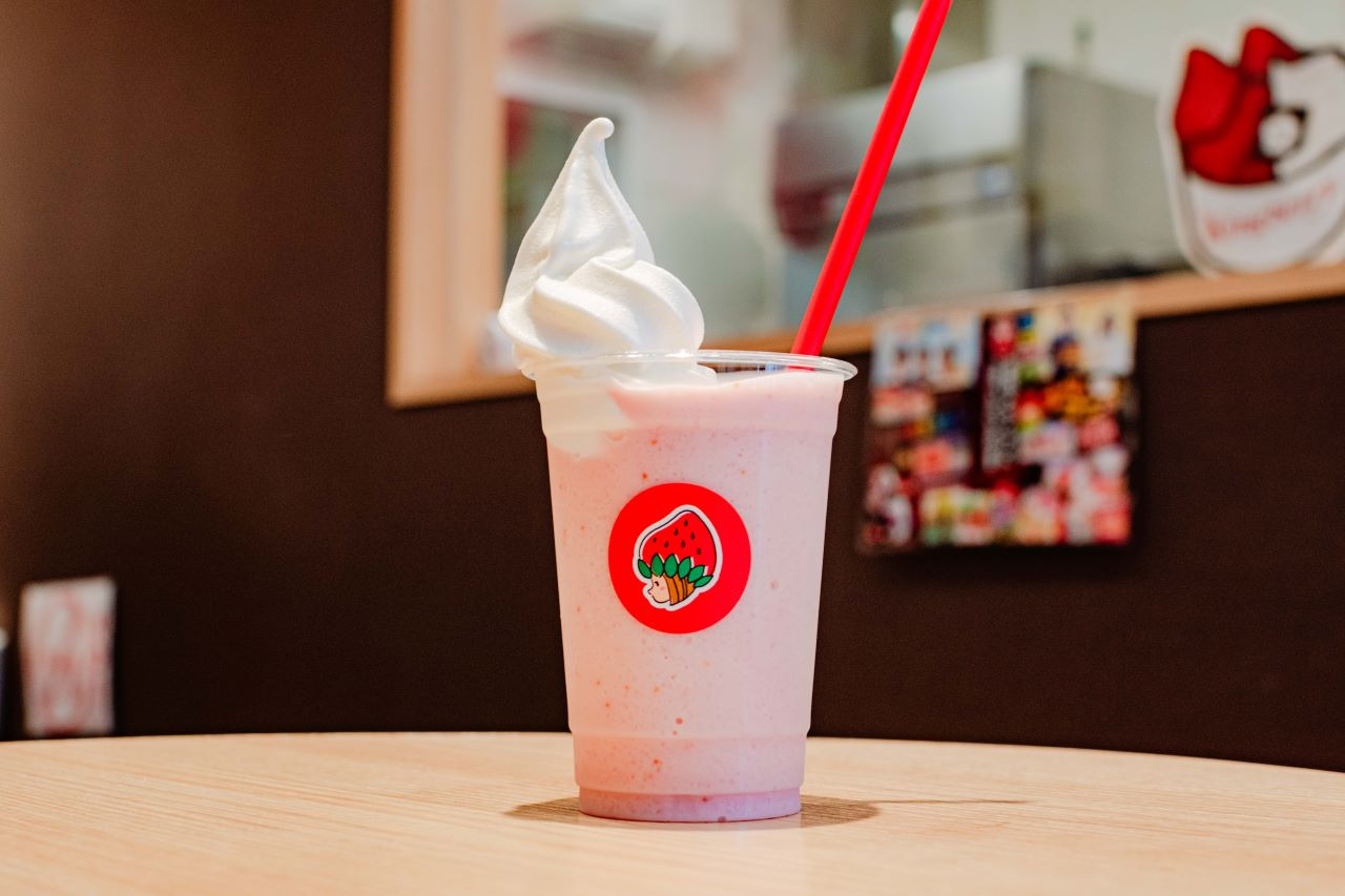첫맛은 새콤달콤하고 깔끔한 맛이 퍼집니다. 위에 올려져 있는 소프트 아이스크림과 섞어 마시면, 크리미한 달콤함이 더해져 절묘한 매칭.딸기 알갱이가 듬뿍 들어 있고, 쫀득쫀득한 식감도 딸기를 좋아하는 사람에게는 참을 수 없는 즐거움을 선사합니다!~