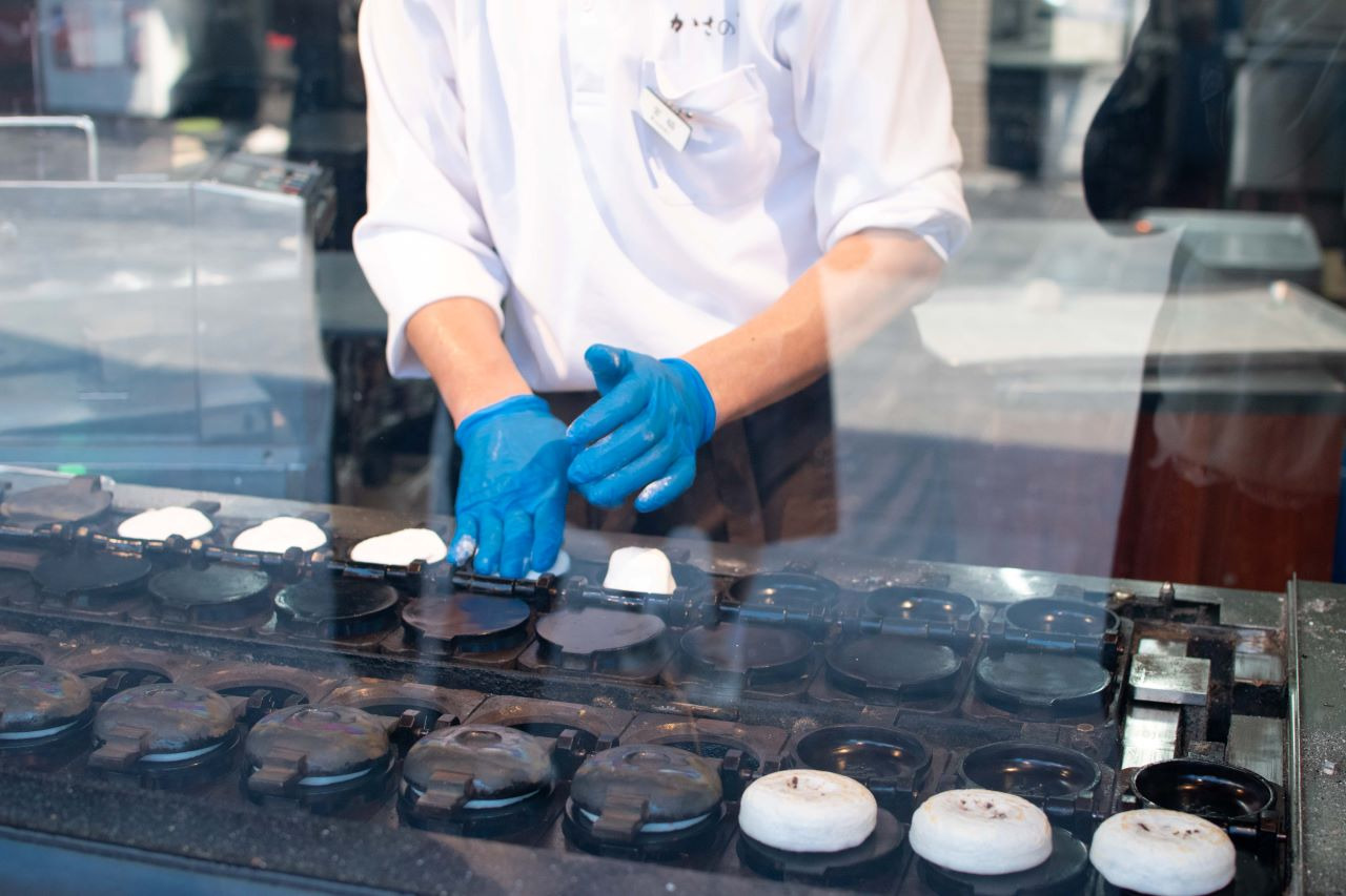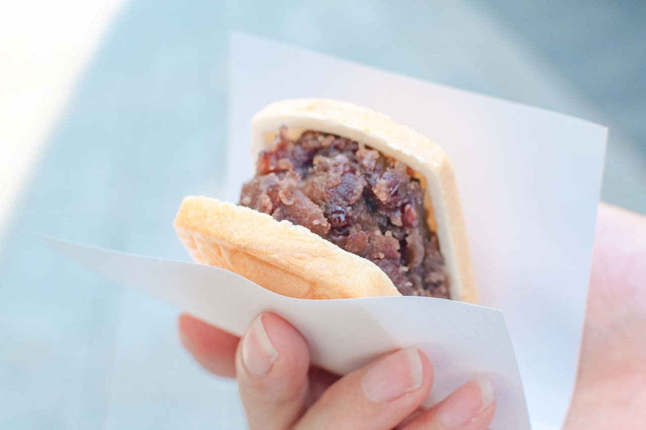 끊임없이 손님이 줄을 서 대성황~ 명물은, 홋카이도 도카치산의 팥을 듬뿍 사용한「도깨비기와나카」(230엔)!!~ 주문을 받고 나서, 바삭바삭한 가운데에 팥소를 채워 줍니다.