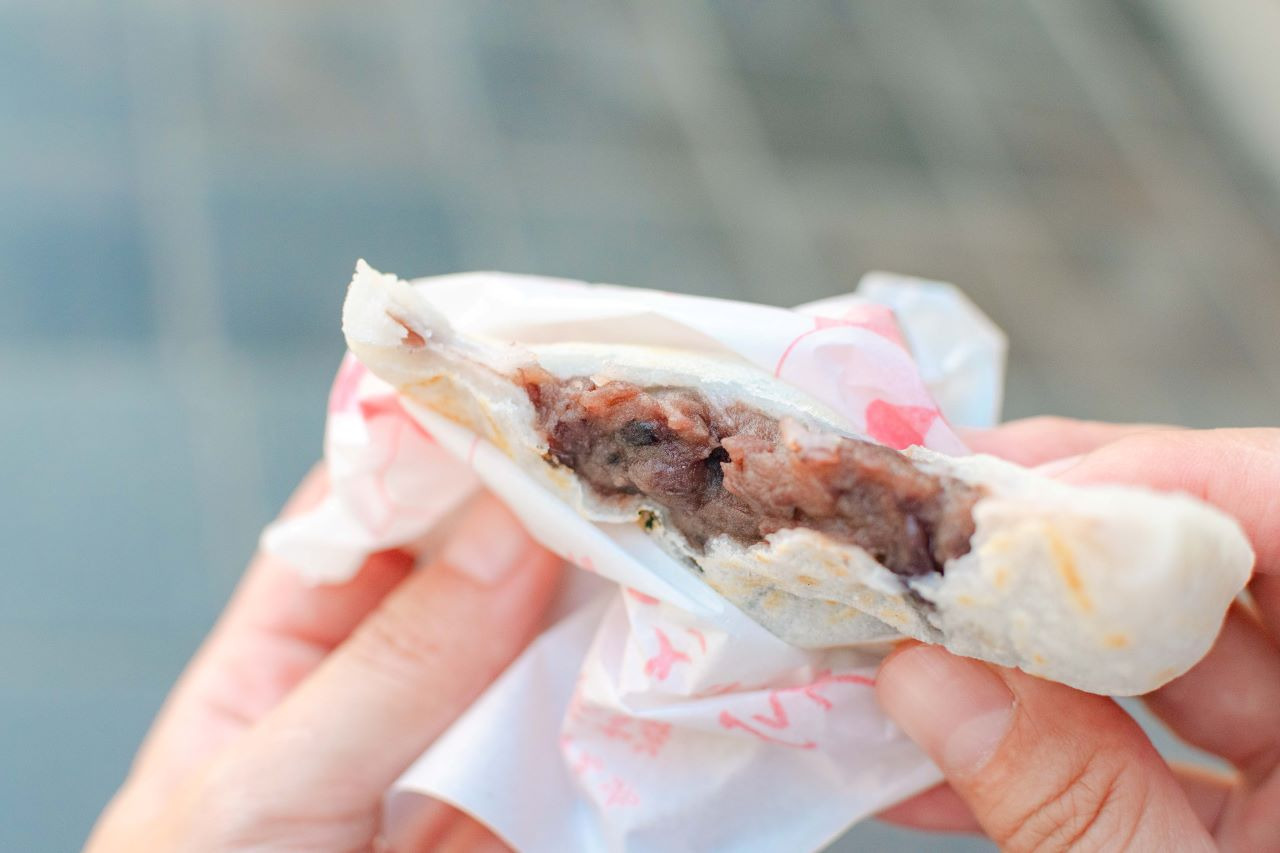 갓 만든 따뜻한 우메가에모치(150엔)를 먹으면, 안에는 따끈따끈한 팥 앙금이 가득 차 있어, 한입 먹으면 행복한 기분은 덤~