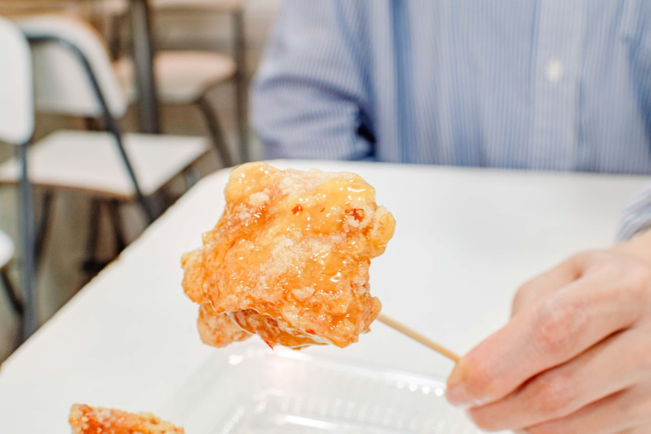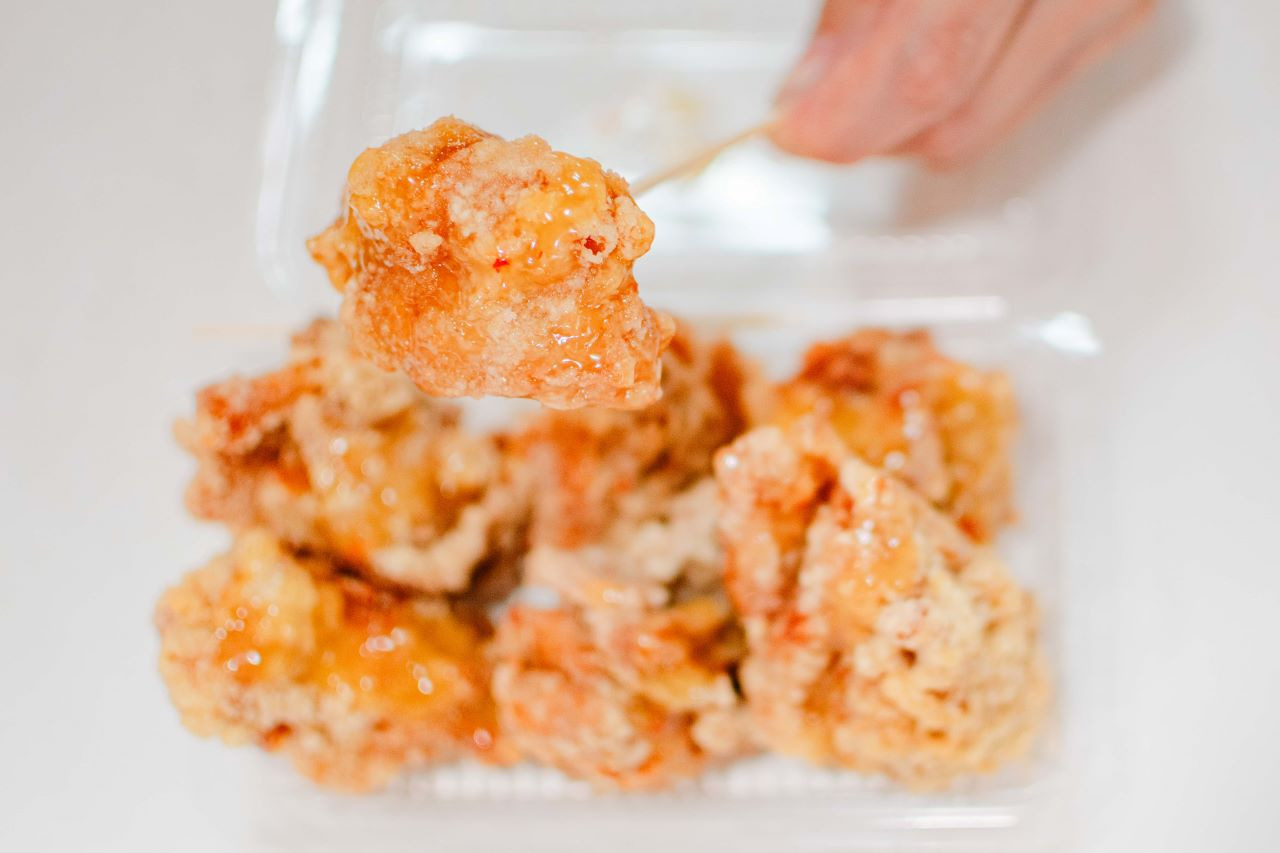「지쿠시안에서 아게」(500엔)는, 육수나 조미료를 고집한 일품.플레인 외에 유자 짠맛 등의 종류도 있습니다. 매콤달콤한 양념이 듬뿍 들어간 가라아게는 한 번 먹으면 중독되는 맛~