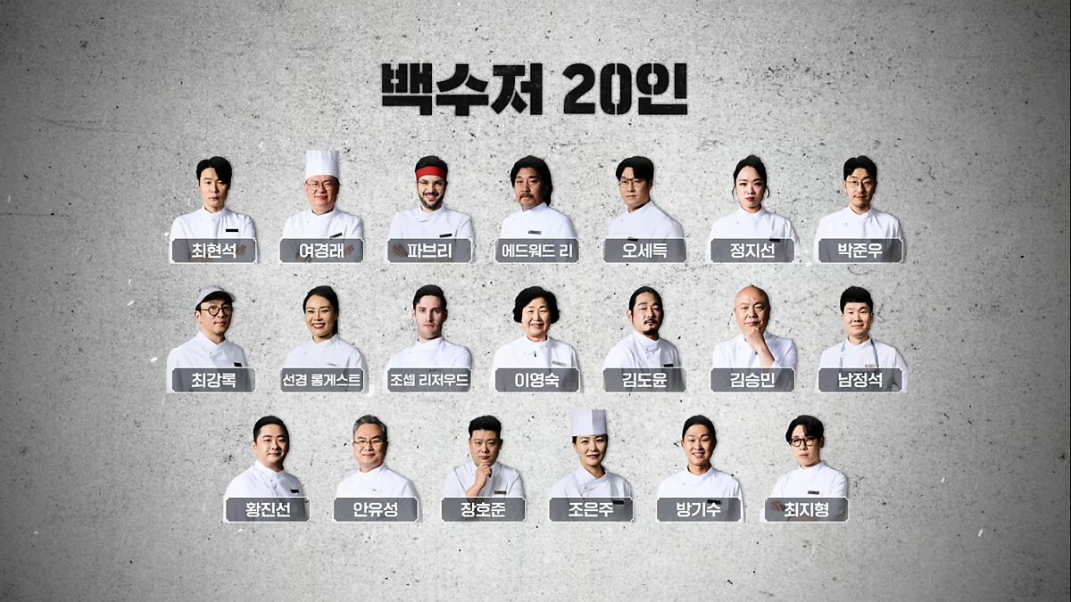 흑백요리사의 계급은 백수저와 흑수저로 나뉩니다. 백수저들은 요리계에서 명망이 높은 유명 셰프 20인을 엄선하여 섭외하였고, 최소 국내외 유명 요리 대회 수상 경력이 있거나, 본인 휘하에 요리사가 수십명이 딸려있는 규모 있는 업장의 총괄 셰프, 혹은 국가의 인증이나 미쉐린 가이드 스타를 꾸준히 받은 셰프라고 해요.