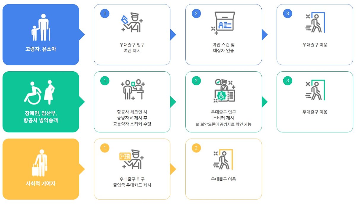 모든 국민이 이용할 수 있는 스마트패스와 달리 패스트트랙은 인천공항에서 제공하는 교통약자 출국 우대 서비스입니다. 고령자, 유소아, 장애인, 임산부, 항공사 병약승객, 사회적 기여자 등에게 제공되는 혜택으로 최대 3인까지 동반 이용이 가능해요.