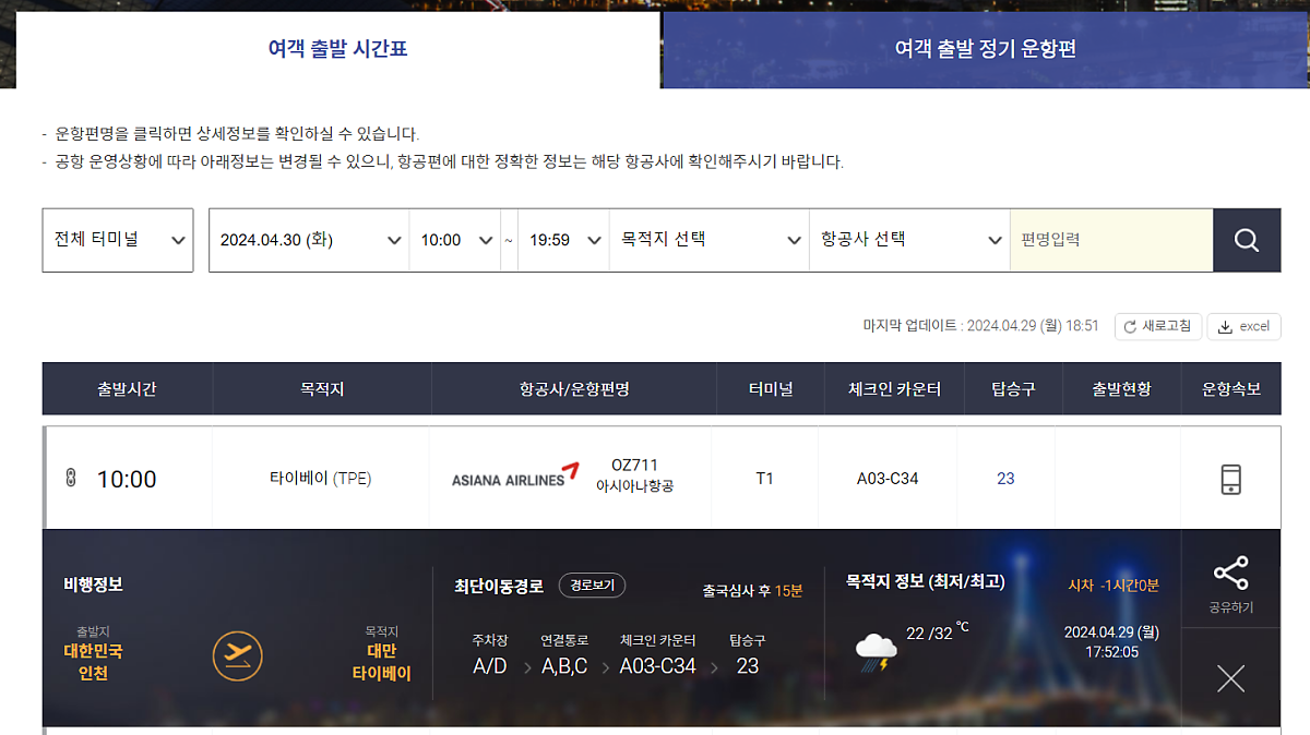 A. 내 항공권의 체크인 카운터 위치는 인천공항 홈페이지 여객 출발 시간표에서 직접 확인할 수 있는데요. 터미널과 탑승구까지 최단 이동경로까지 나와 있답니다. 공항 도착한 후에는 출발층에 있는 운항정보 안내 모니터(FIDS)에서도 체크인 카운터를 보실 수 있으니, 혹시 변경된 사항은 없는지 끝까지 확인하는 건 필수!
