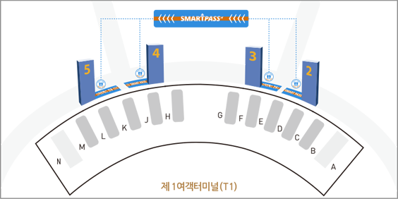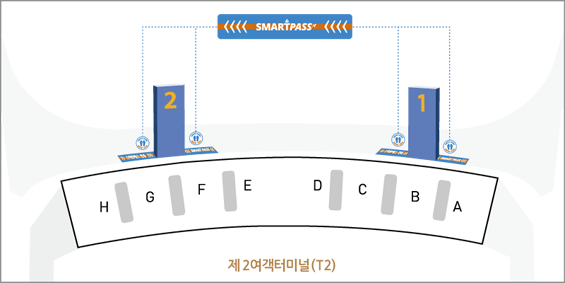 A. 스마트패스 전용 게이트는 각각 다음 위치에 마련되어 있습니다. 현장에서 헷갈리는 일이 없도록 위의 이미지를 통해 정확한 위치를 확인해 주세요.