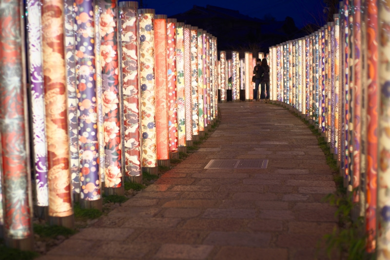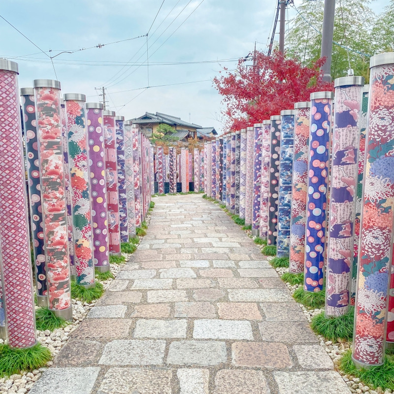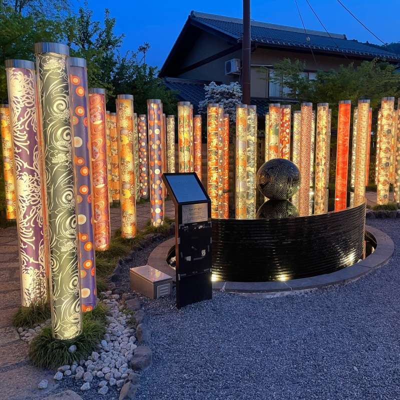교유젠의 원단을 사용한 약 600개의 폴을 숲으로 형상화한 것으로, 기모노로 산책하는 것도 추천!!