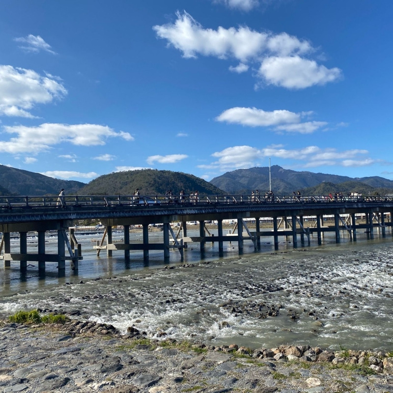 헤이안 시대 초기, 가쓰라가와 남쪽에 있는 절의 참배 통로로서 걸려진, 길이 155m의 다리입니다~