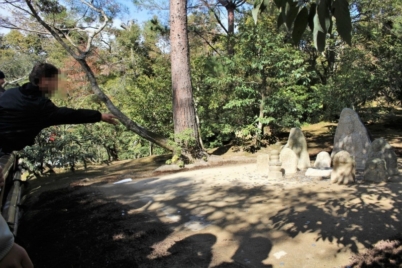 유명한 석정은 삼면을 둘러싼 폭 25m, 깊이 10여m의 직사각형 백사에 15개의 돌을 배치한 단순한 명원입니다.