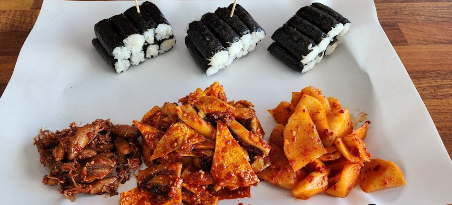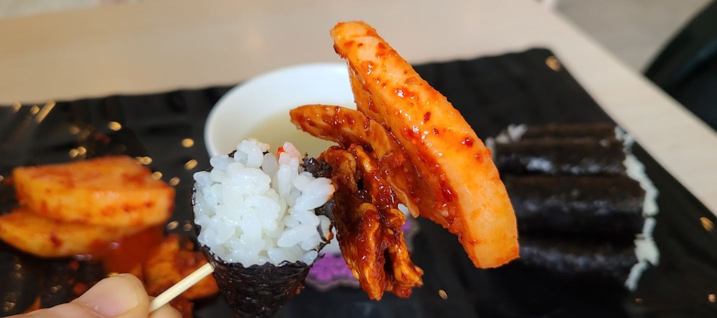 꼬마 김밥 사이즈의 말 그대로 "김+밥"에 매콤한 섞박지를 올려먹는 바로 그 음식입니다!~